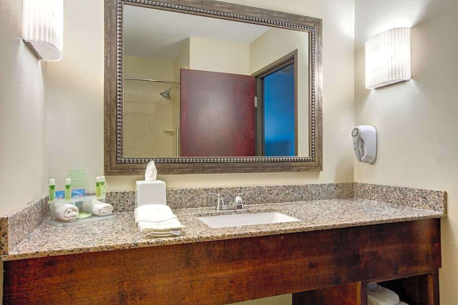 Wider doorways, a raised toilet seat, and a bathroom with grab bars are featured in this wheelchair accessible suite.